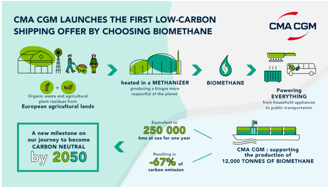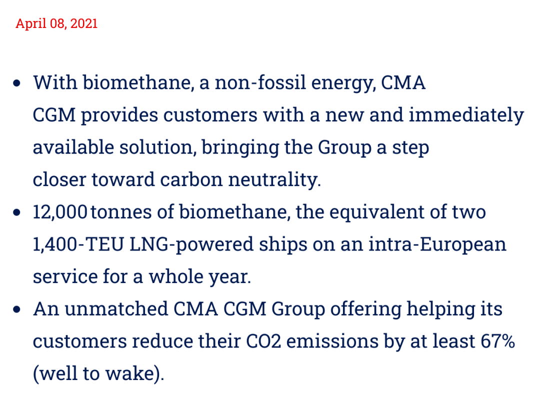 從今年5月起,達飛的客戶可以選擇以生物甲烷為燃料的船舶來運輸貨物。4月8日,達飛在官網(wǎng)宣布,將于今年5月推出首批基于生物甲烷(biomethane)的低碳產(chǎn)品,為客戶提供全新的綠色運輸解決方案。這將加快其在航運領(lǐng)域引領(lǐng)能源轉(zhuǎn)型的承諾——努力實現(xiàn)“2050碳中和”的目標。